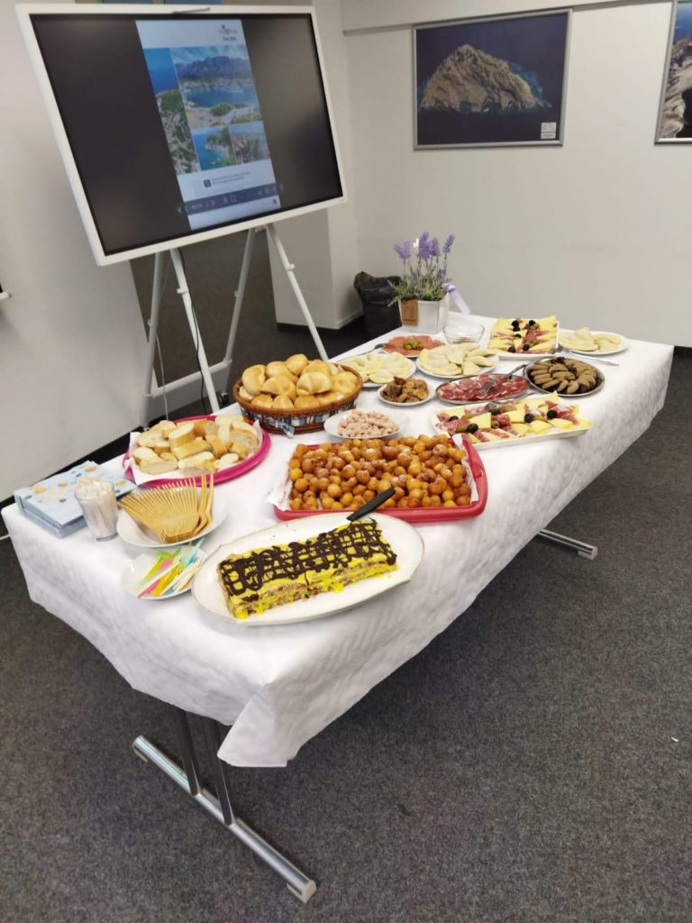 Večer je završila pjevanjem dalmatinskih pjesama uz pratnju gitara i degustacijom dalmatinskih specijaliteta: splitske torte, imotskih rafiola, pršuta, sira, maslina, fritula, ušećerenih badema, suhih smokvi… Bio je to susret pun mirisa i okusa Dalmacije.