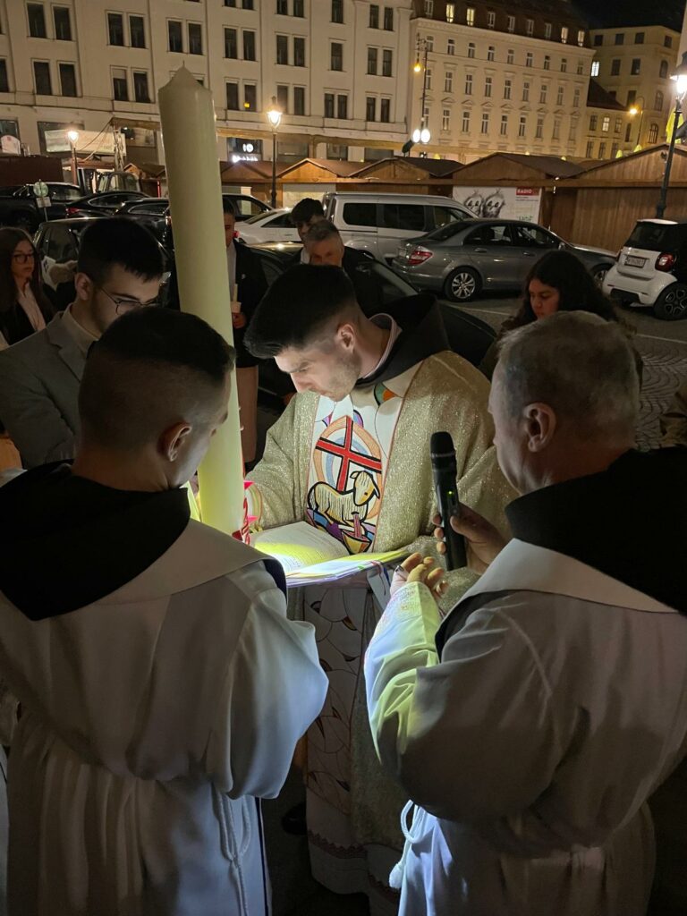 Nakon uvodnog blagoslova ognja i paljenja i ukrašavanja uskrsne svijeće naši svećenici i fra Ivan su u pratnji ministranata unijeli svijeću u zamračenu crkvu te je fra Radovan u službi svjetla svečano otpjevao hvalospjev uskrsnoj svijeći.