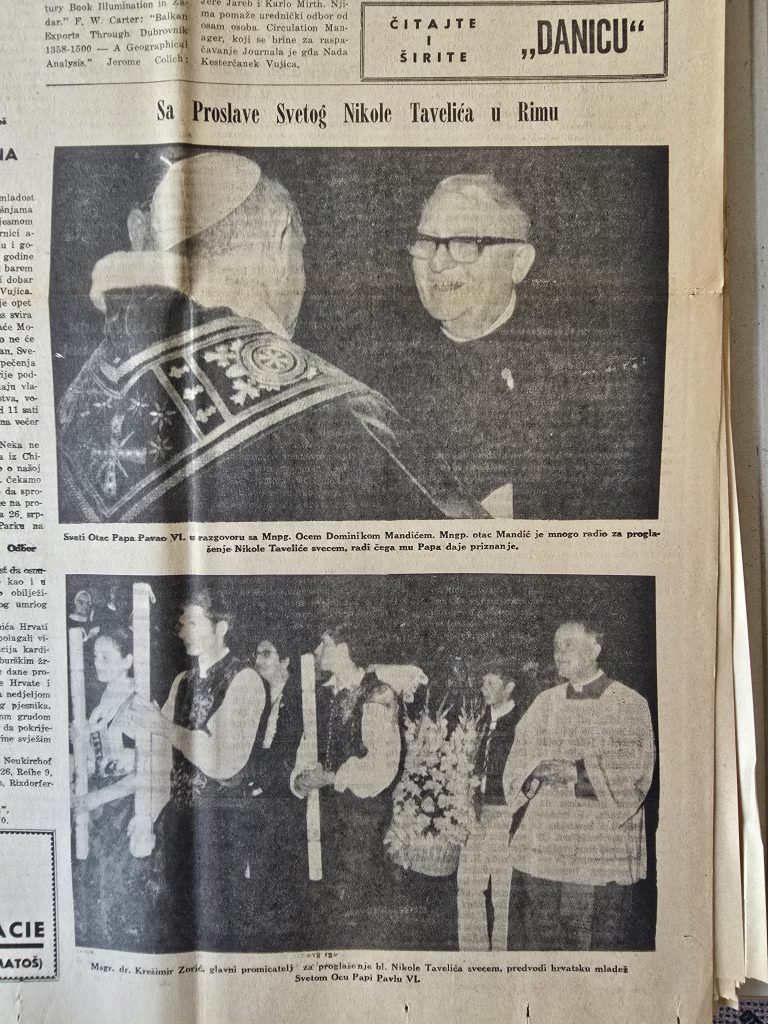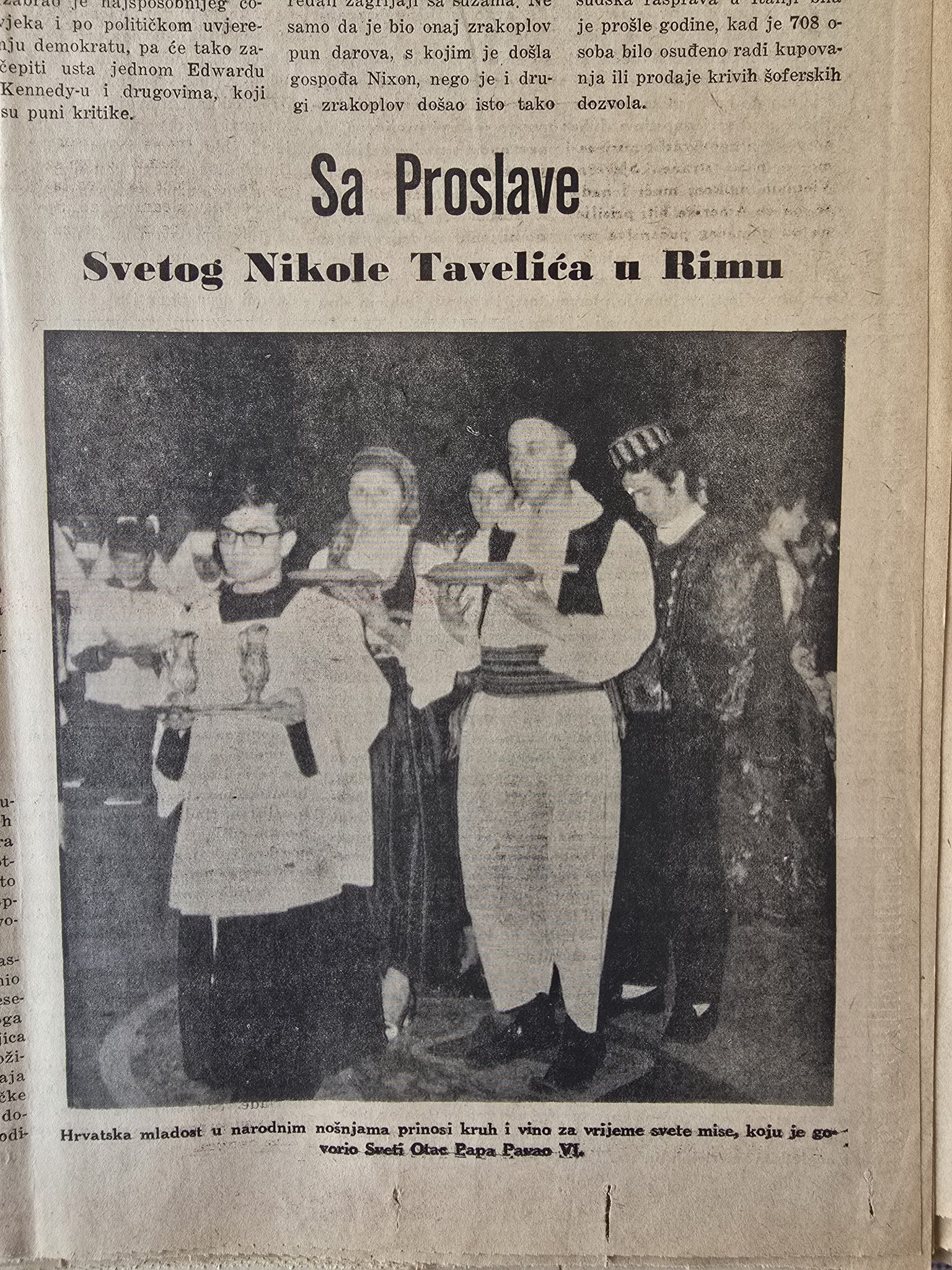 Dana 21. lipnja 1970. g0dine, papa Pavao VI. u prisustvu svih hrvatskih nadbiskupa i biskupa, nekoliko stotina hrvatskih svećenika, redovnika i redovnica te oko 15 tisuća hodočasnika iz svih krajeva hrvatskoga etničkog teritorija, tada u sastavu komunističke Jugoslavije, stare dijaspore te iseljeništva, proglasio je prvoga sveca iz reda hrvatskoga naroda – Nikolu Tavelića. On je kao franjevac podnio mučeničku smrt u Jeruzalemu 14. studenoga 1391. godine. Iako ga se vrlo brzo nakon toga započelo štovati na razne načine, blaženim ga je proglasio tek papa Lav XIII. 1889. godine.