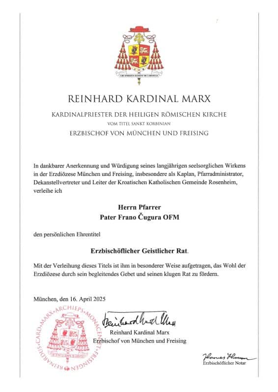 Münchenski nadbiskup kardinal Reinhard Marx odlikovao je u srijedu četvoricu svećenika počasnim naslovom „Nadbiskupskog duhovnog vijećnik“, Među njima je i bio fra Frano Čugura, voditelj Hrvatske katoličke zajednice Rosenheim.