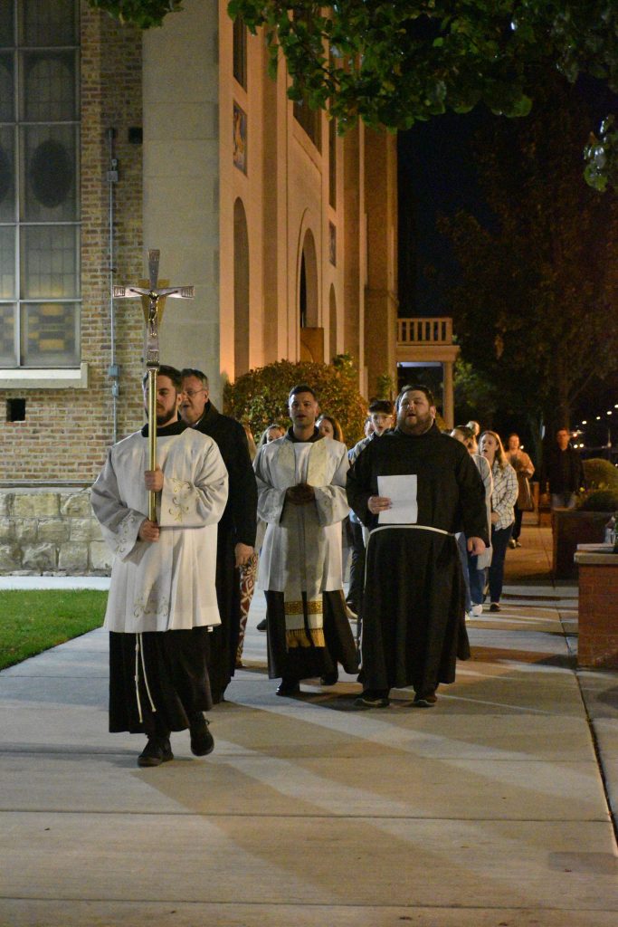 Uslijedilo je euharistijsko klanjanje koje su glazbom pratili mladi iz slavljeničkog tima Opere Christi, Hrvatske katoličke mladeži. Večer je završena svečanom procesijom prema novoizgrađenom svetištu Gospe Međugorske – Kraljice Mira gdje je fra Zvonimir blagoslovio njezin novi dom i posvetio obnovljeni kip Kraljice koji je originalno blagoslovio fra Jozo Zovko godine 1997.