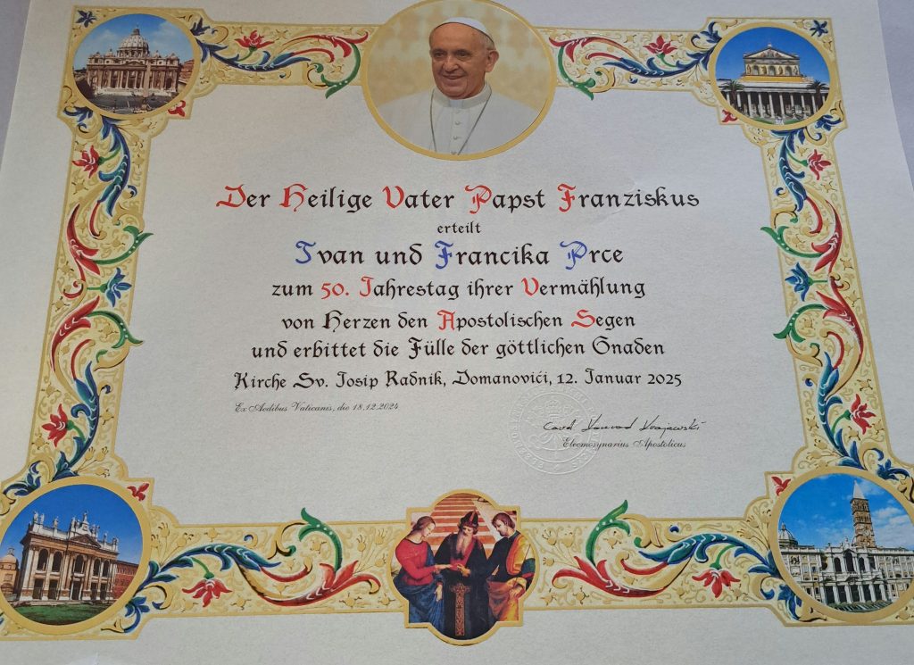 Ivan i Francika Prce iz Salacha proslavili su jučer u crkvi St. Maria u Geislingenu velikih 50 godina braka. Sakrament ženidbe sklopili su 12. siječnja 1975. u crkvi sv. Josipa Radnika u Domanovićima, u Bosni i Hercegovini.