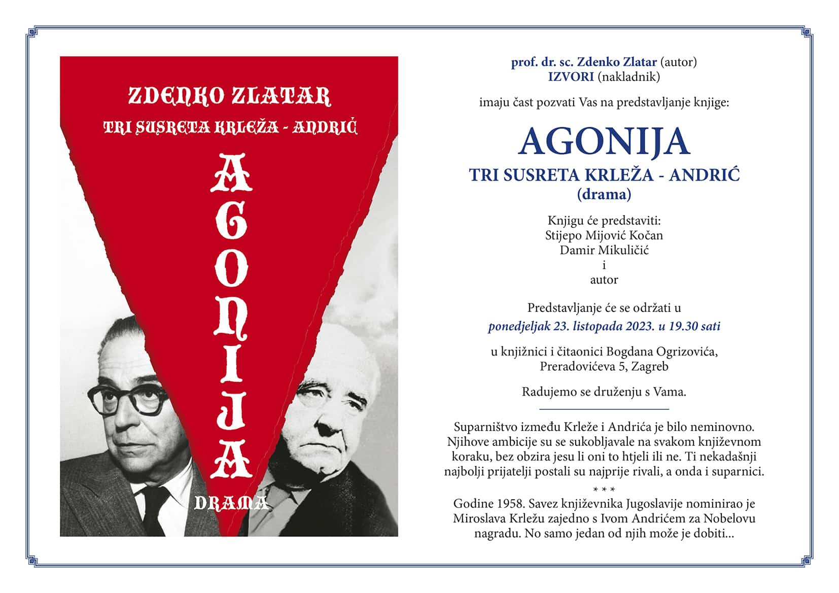 “AGONIJA” je nova knjiga o sukobu između Miroslava Krleže i Ive Andrića, dva književnika u vrijeme bivše Jugoslavije. U sukobu Andrića i Krleže sadržana je cijela povijest odnosa između politike i poetike. A u taj sukob upliće se još i Nobelov komitet. Naime. godine 1958. Savez književnika Jugoslavije nominirao je Miroslava Krležu zajedno s Ivom Andrićem za Nobelovu nagradu. No samo jedan od njih može je dobiti…