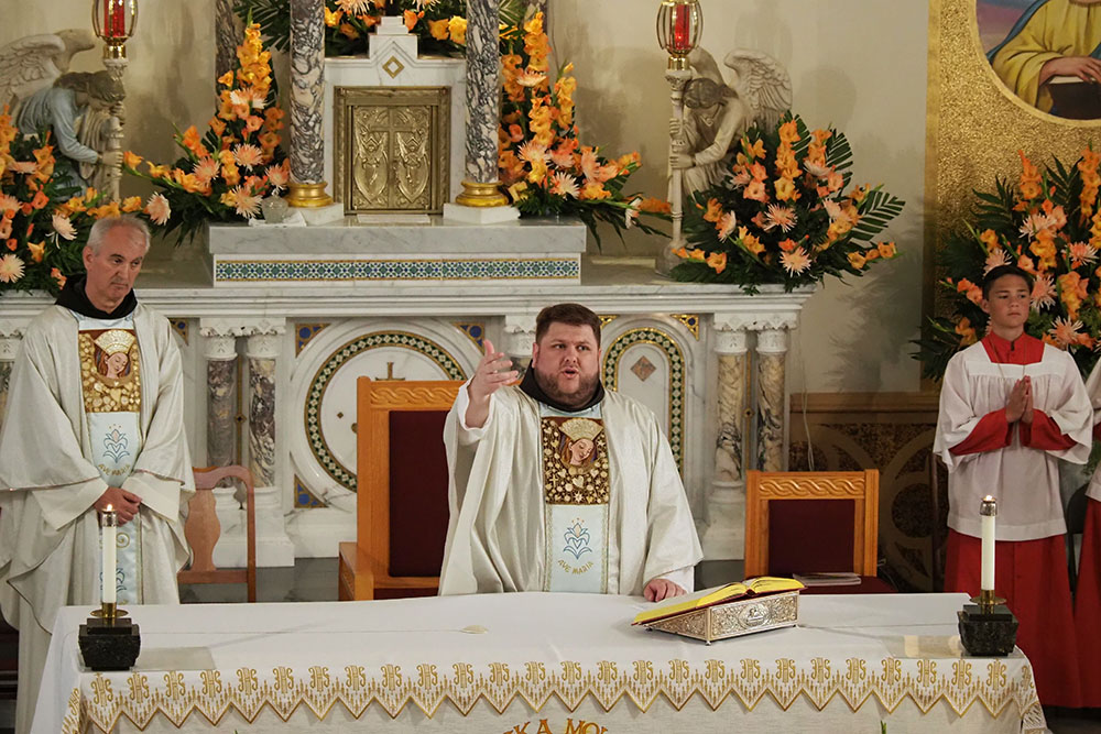 Svečanu svetu misu predvodio je fra Antonio Musa, franjevac koji djeluje skoro tri godine u ovoj župi. U izvrsnoj propovijedi fra Antonio se dotaknuo povijesti hoda s Gospom i godine 1715. te povijest spasenja u kojem Marija ima važnu ulogu. Dotičući se slavne povijesti hrvatskoga hoda s Gospom u njenim svetištima i u domovini i u iseljeništvu, fra Antonio je ljudima ponudio primjer Marije koja nadahnjivaše naraštaje prije nas i nadahnjuje i nas danas.