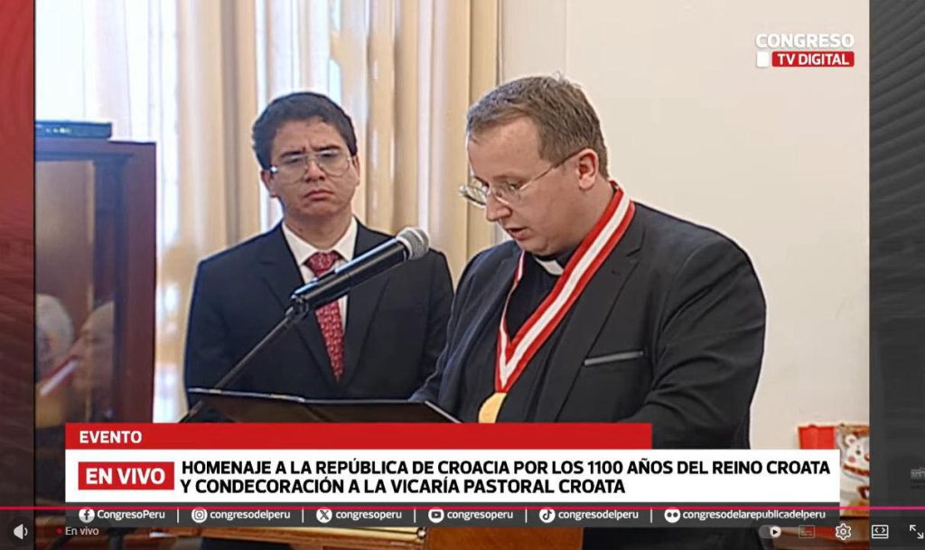 Istog dana uslijedio je dirljiv trenutak državnog priznanja u Kongresu Republike Peru. U veličanstvenoj dvorani “Miguel Grau”, pod pokroviteljstvom zastupnice Adriane Tudele, predsjednice Lige hrvatsko-peruanskog prijateljstva, iskazana je posebna zahvala Republici Hrvatskoj na prijateljskim odnosima, te posebna zahvala Hrvatskom pastoralnom vikarijatu u Limi kao i delegaturi hrvatske inozemne pastve za Južnu Ameriku. Hrvatski pastoralni vikarijat u Peruu i njegovi neumorni djelatnici – mons. Drago Balvanović, pastoralni vikar, i vlč. Marko Jukić, župnik i delegat za Južnu Ameriku – odlikovani su “Medaljom časti” za poseban doprinos razvoju društvenog, karitativnog i duhovnog života u Peruu.