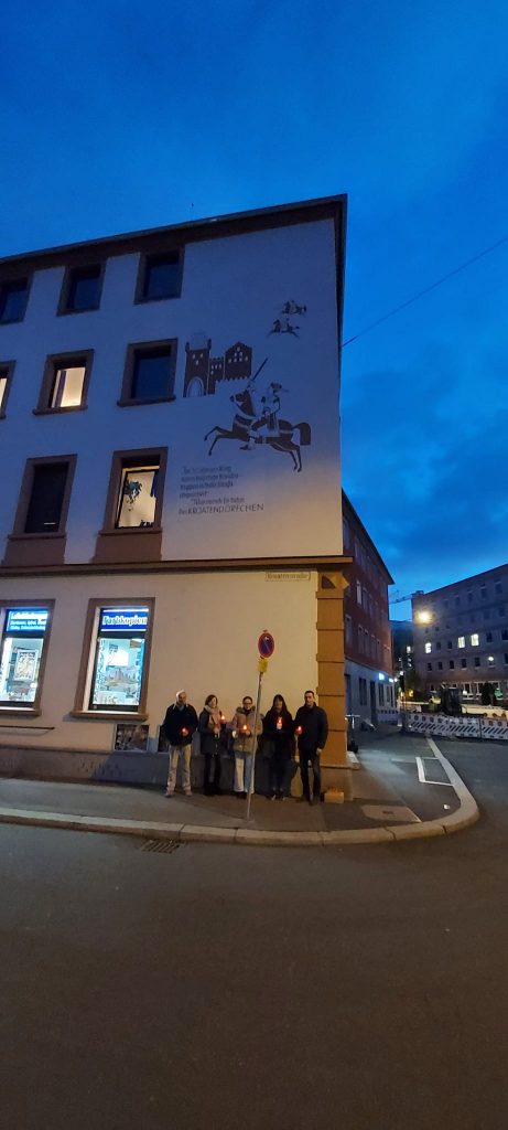 Zapalivši svijeće podno murala posvećenog hrvatskim vojnicima iz Tridesetogodišnjeg rata u ulici Kroatengasse, vjernici su izmolili krunicu Blažene Djevice Marije, nakon čega je župnik Hrvatske katoličke misije Würzburg fra Ivan Penava izmolio odrješenje za sve žrtve Domovinskog rata i poginule branitelje.