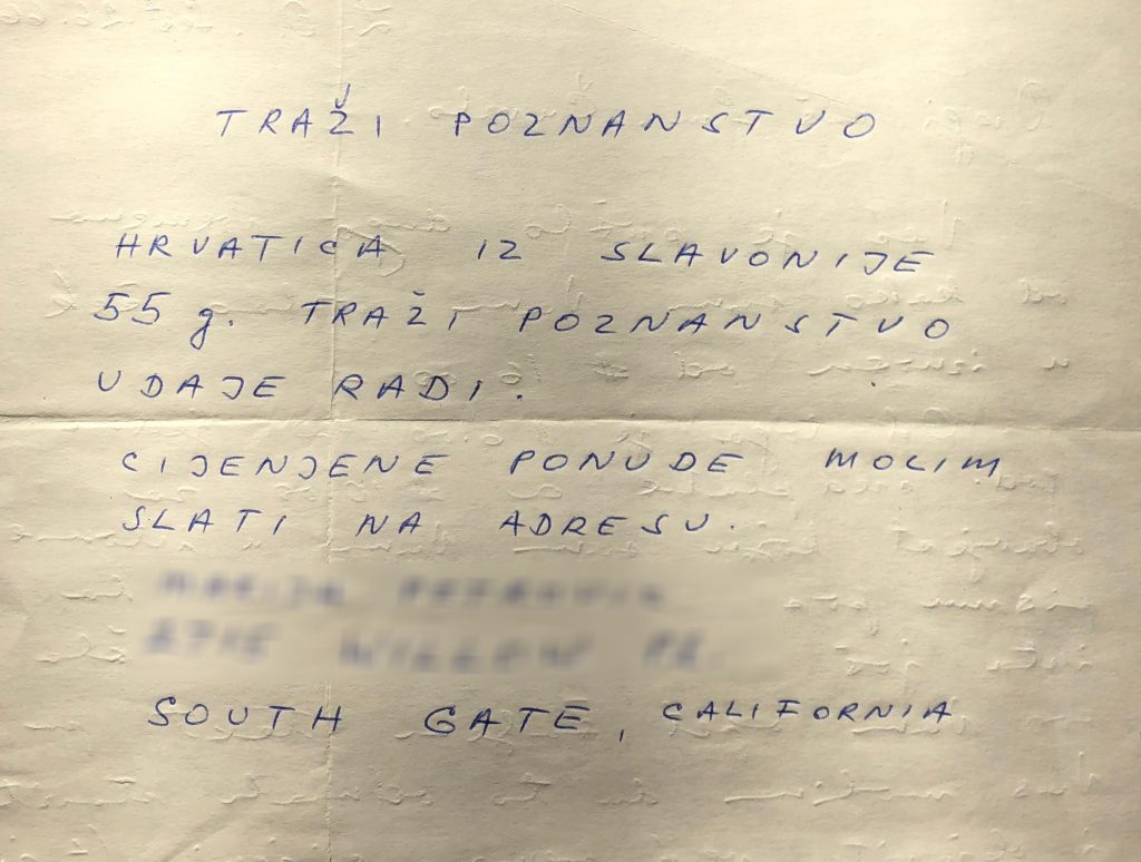 U osobnom fondu fra Ljube Čuvala u Hrvatskom etničkom institutu čuva se stari “oglas” u kojem 55-godišnja Hrvatica iz Slavonije, s adresom u Kaliforniji, “traži poznanstvo udaje radi”. Navedena je adresa na koju se mogu slati “cijenjene ponude”. Uvjeti nisu poznati.
