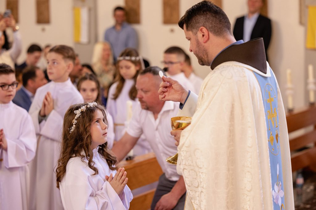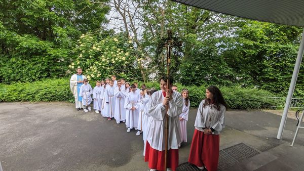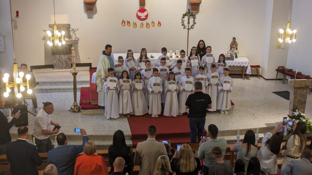 Na svetkovinu Duhova u prepunoj crkvi St. Johannes Nepomuk u Kloppenheimu pod svečanom misom radosno je proslavljen sakrament prve pričesti koji je primilo sedam djevojčica i 13 dječaka.