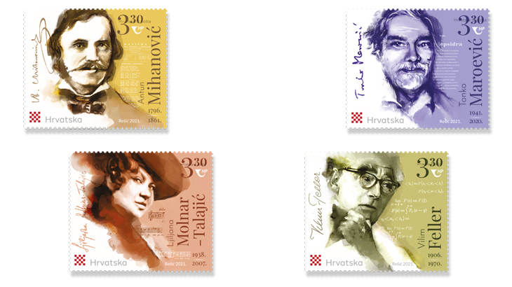 Hrvatska pošta predstavila je danas četiri nove prigodne poštanske marke iz serije „Znameniti Hrvati“, na kojima su prikazani: Ljiljana Molnar Talajić, William Feller, Tonko Maroević i Antun Mihanović. Autorica izdanja je Sabina Rešić, akademska slikarica i dizajnerica iz Zagreba. Marke su otisnute u nakladi od 50 tisuća primjeraka po motivu, a nominalna vrijednost je 3,30 […]