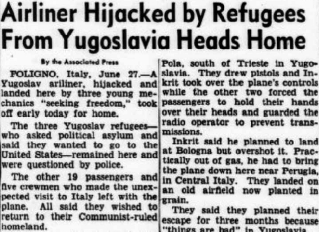 Ali jedan od najdramatičnijih slučajeva bježanja iz komunističke Jugoslavije bila je otmica zrakoplova koji je letio iz Zagreba u Pulu. Taj je događaj odjeknuo cijelim slobodnim svijetom, ali se u Jugoslaviji nije smjelo doznati o tome. Oni koji su slučajno doznali, morali su šutjeti.