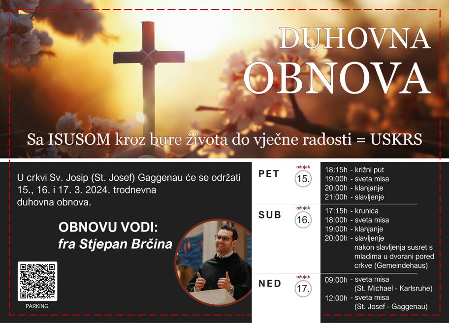 U crkvi St. Josef u Gaggenau održat će se od 15. do 17. ožujka 2024. korizmena duhovna obnova koju će voditi fra Stjepan Brčina, franjevac konventualac iz župe sv. Antuna Padovanskog u Zagrebu.