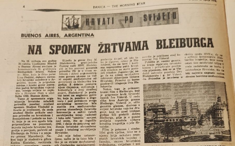 Slično kao i u Torontu, u Sydneyju su se od 1985. godine komemoracije održavale na zemljištu Hrvatskog kulturnog društva „Bosna“, gdje je podignut spomenik posvećen isključivo žrtvama bleiburške tragedije. Još istaknutiju, vodeću ulogu u komemoracijama imali su mladi Hrvati u drugoj polovici 1980-ih godina u Argentini. Potonje su komemoracije dijelom imale prosvjedni karakter budući da su uključivale prosvjednu šetnju središtem Buenos Airesa, a s ciljem upoznavanja argentinske javnosti i relevantnih faktora ne samo s bleiburškom tragedijom, nego i aktualnim položajem hrvatskoga naroda u Jugoslaviji te isticanje zahtjeva za samoodređenjem.