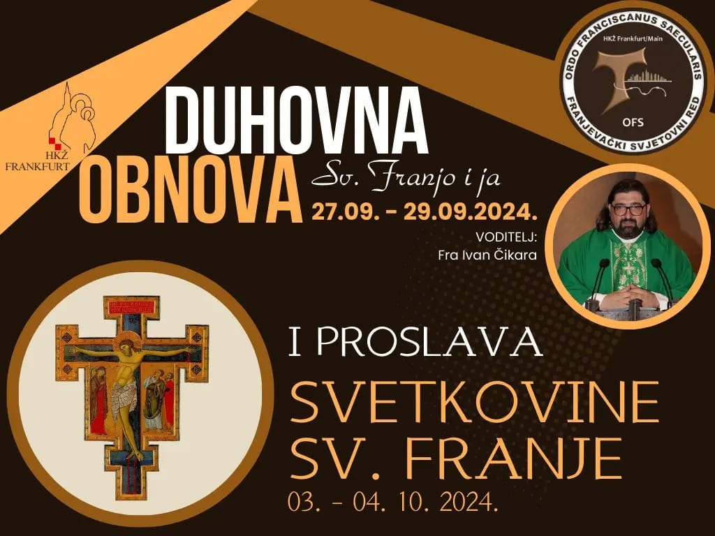 Uoči svetkovine sv. Franje, Franjevački svjetovni red Hrvatske katoličke župe Frankfurt poziva na duhovnu obnovu koja će se održati od 27. do 29. rujna 2024. u crkvi sv. Ante.