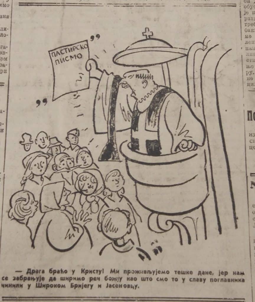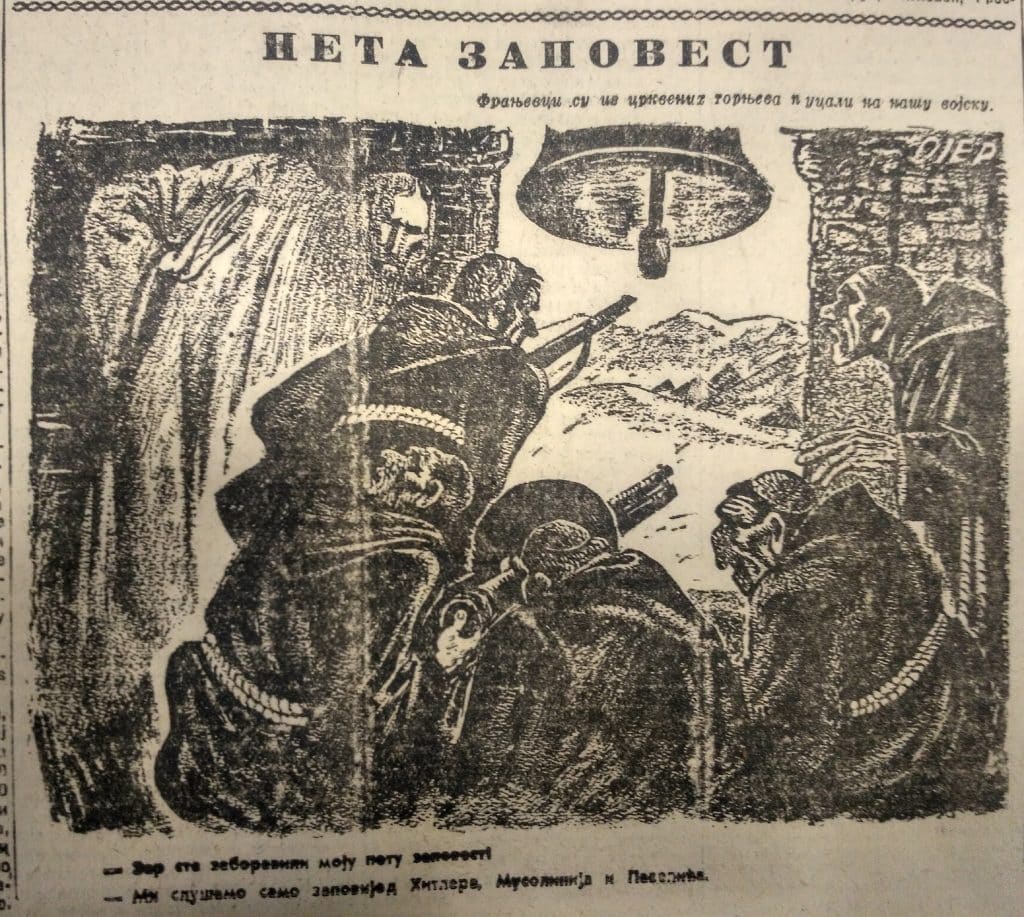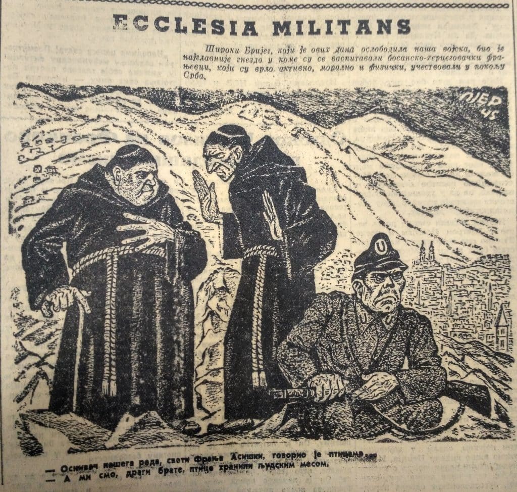 Na naslovnici beogradske Politike objavljena je 11. veljače 1945. karikatura pod naslovom „Ecclesia Militans“ ispod koje je pisalo: „Široki Brijeg, koji je ovih dana oslobodila naša vojska, bio je najustaškije gnezdo u kome su se vaspitovali bosansko-hercegovački fratri, koji su vrlo aktivno, moralno i fizički, učestvovali u pokolju Srba”. Unutar karikature dominiraju dvojica širokobrijeških franjevaca u razgovoru, a ispred njih čuva stražu ustaški vojnik. Franjevci u karikaturi vode sljedeći dijalog: „Osnivač našeg reda, sveti Franjo Asiški, govorio je pticama… A mi smo, dragi brate, ptice hranili ljudskim mesom.“