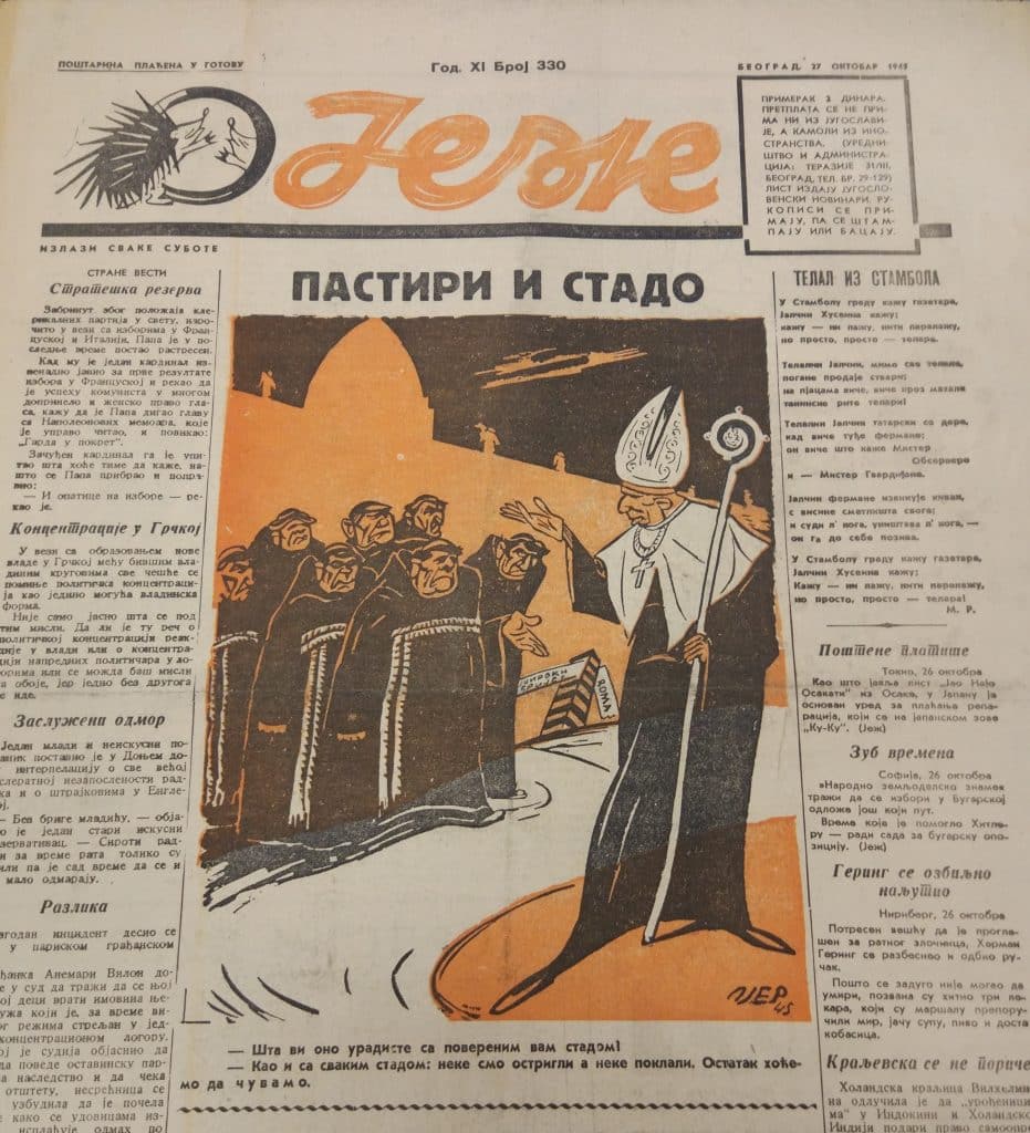 U istom je tjedniku 27. listopada 1945. na naslovnici objavljena karikatura naslovljena s „Pastiri i stado“. U središtu je karikature nadbiskup Stepinac u zapovjedničkom položaju. S lijeve strane karikature nalaze se sedmorica širokobrijeških franjevaca koji pokorno slušaju kritike. Ispod karikature piše: „Šta vi ono uradiste sa poverenim vam stadom! – Kao i sa svakim stadom: Neke smo ostrigli a neke poklali. Ostatak hoćemo da čuvamo”.