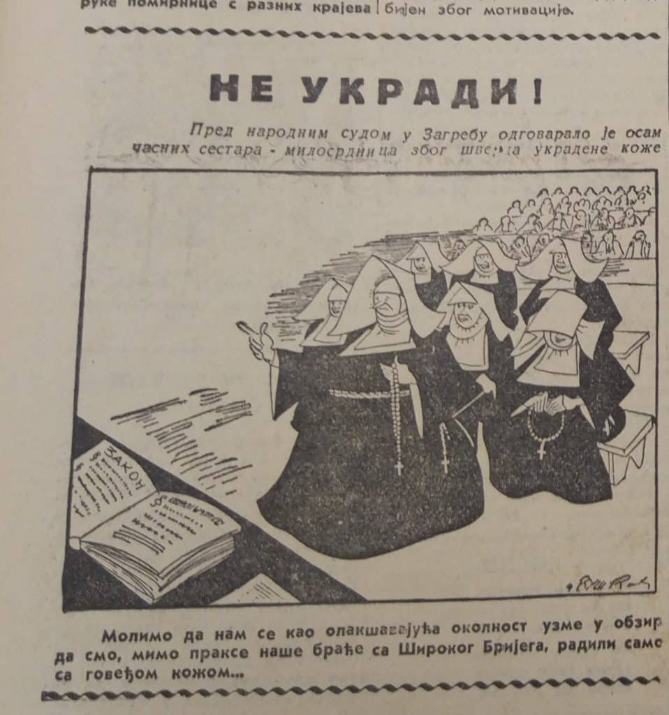 U tjedniku Jež od 15. prosinca 1945. objavljena je karikatura pod naslovom „Ne ukradi“. U središtu je sedam časnih sestara milosrdnica koje su pred Narodnim sudom i porotom u Zagrebu odgovarale zbog šverca ukradene kože. Ispod karikature stoji: „Molimo da nam se kao olakšavajuća okolnost uzme u obzir da smo, mimo prakse naše braće sa Širokog Brijega, radili samo sa goveđom kožom…“2