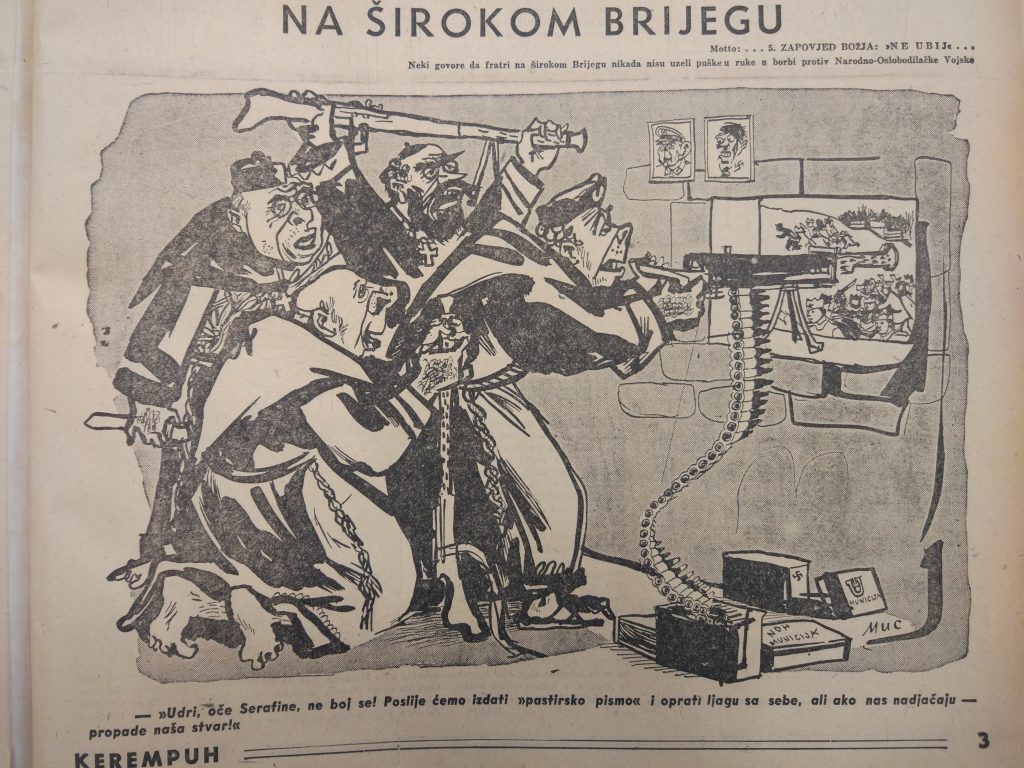 Zagrebački zabavni list Kerempuh bio je još izravniji u napadima na hercegovačke franjevce. Tako je u tom listu 14. listopada 1945. objavljena karikatura „Na Širokom Brijegu“. Iznad karikature stoji: „Moto: … 5. zapovijed Božja ‘Ne ubij’. Neki govore da fratri na Širokom Brijegu nikada nisu uzeli puške u ruke u borbi protiv Narodnooslobodilačke vojske”. Na karikaturi dominiraju četiri širokobriješka franjevca koji u vrijeme borbi za Široki Brijeg pucaju puškostrojnicama iz samostana po pripadnicima NOVJ-a. Ispod karikature stoji: „Udri oče Serafine, ne boj se! Poslije ćemo izdati ‘pastirsko pismo’ i oprati ljagu sa sebe, ali ako nas nadjačaju – propade naša stvar!“1