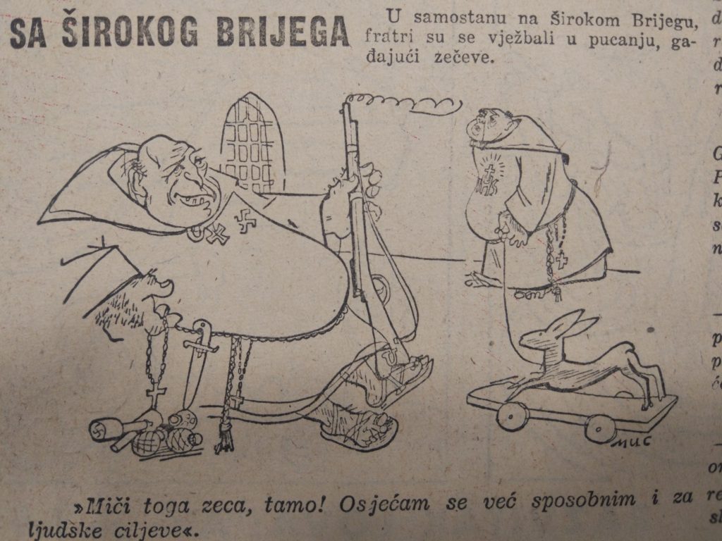 U istom je listu 6. siječnja 1946. objavljena karikatura pod naslovom „Sa Širokog Brijega“ uz opis „U samostanu na Širokom Brijegu fratri su se vježbali u pucanju, gađajući zečeve“. Na karikaturi dominira debeo franjevac u sjedećem položaju opasan ručnim bombama, s nožem, krunicom, kukastim križem i križem oko vrata te s puškom u lijevoj ruci. U desnom kutu karikature nalazimo također debelog franjevca koji vuče drvenu igračku u obliku zeca. Naoružani širokobriješki franjevac viče: „Miči toga zeca, tamo! Osjećam se već sposobnim i za ljudske ciljeve!“