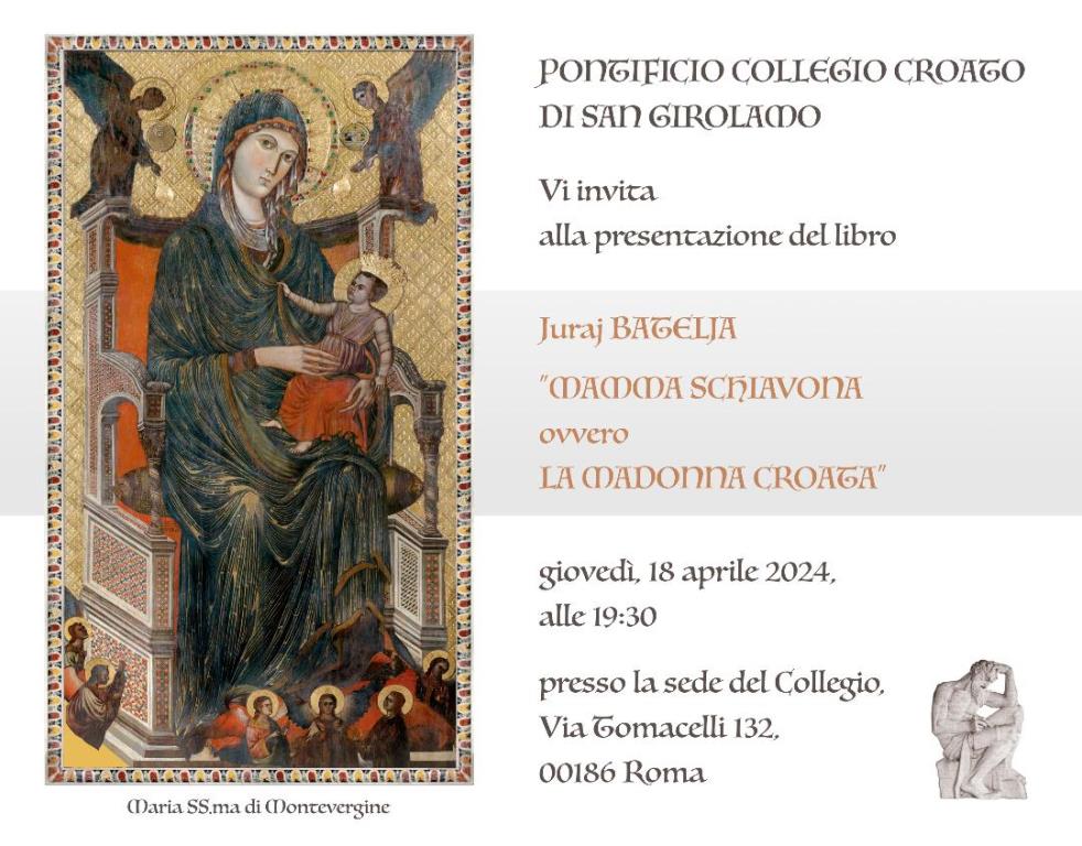 U prostorima Papinskog hrvatskog zavoda sv. Jeronima u Rimu u četvrtak 18. travnja u 19.30 sati bit će predstavljena knjiga mons. Jurja Batelje „MAMMA SCHIAVONA ovvero LA MADONNA CROATA“.