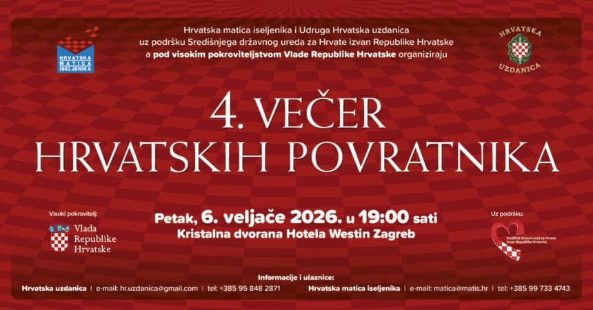 Udruga Hrvatska uzdanica i Hrvatska matica iseljenika, uz podršku Središnjeg državnog ureda za Hrvate izvan Republike Hrvatske, organiziraju 4. Večer hrvatskih povratnika.