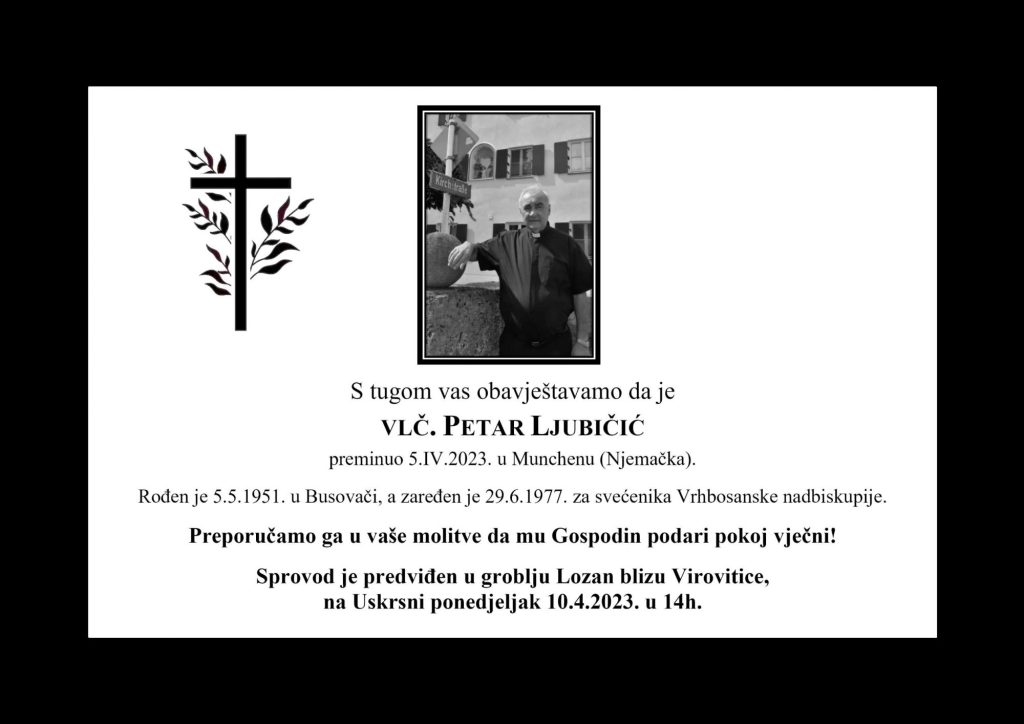 Vlč. Petar Ljubičić, svećenik Vrhbosanske nadbiskupije, preminuo je 5. travnja u bolnici u Münchenu u 72. godini života.