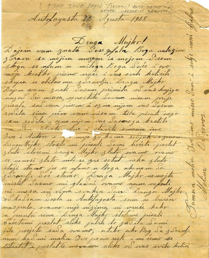 Dajem vam znati da se zafala Bogu nalazim z drava sa mojim muzem is mojom dicom stoga se ufam u miloga Boga daće i ovo moje kratko pismo naći i vas svih kolicih skupau obilnomu zdravlju. Draga Majko Dajem vam znati dasam primila od vas knjigu nazad dvi miseca, oprostite davam nisam prije pisala sad vam pisem i oznanijem vas dasam rodila sina prvo vam nisam tila pisati nego sam rodila i ozna nijem vas dasmo ga krstili na dan Svete Ane i stavili smomu ime Ive i Anton i (bil?) muje za kuma rodjak is zenom. Draga Majko stoste mi pisali dami hoćete poslat zlato stoćemi draga Majko zlato ovamo ovamo se nenosi zlato niti se gre setat neka zlato stoji otamo jos se ufamo u Boga ako nam da zdravlje doć otamo. Draga Majko nemojte mislit dasmo mi gladni ovamo nam nefali ni mesa ni vina svakin dan. Draga Majko od kadsam dosla u Antifagasta sam se baren naspala, ovamo nije nizima ni vruće kako u punta renu…