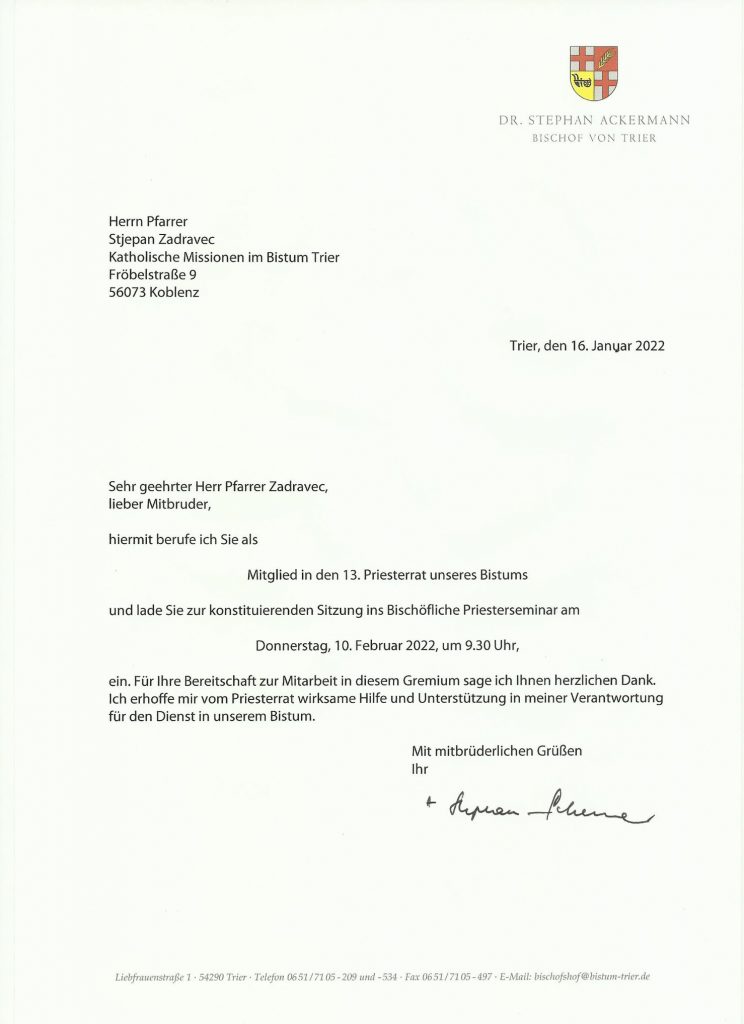 Trierski biskup dr. Stephan Ackermann ponovno je ukazao čast Hrvatskoj katoličkoj misiji Koblenz, imenujući njezinog voditelja već treći puta članom svećeničkog vijeća Biskupije Trier.
