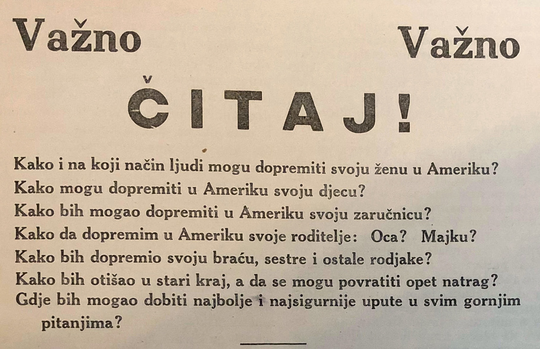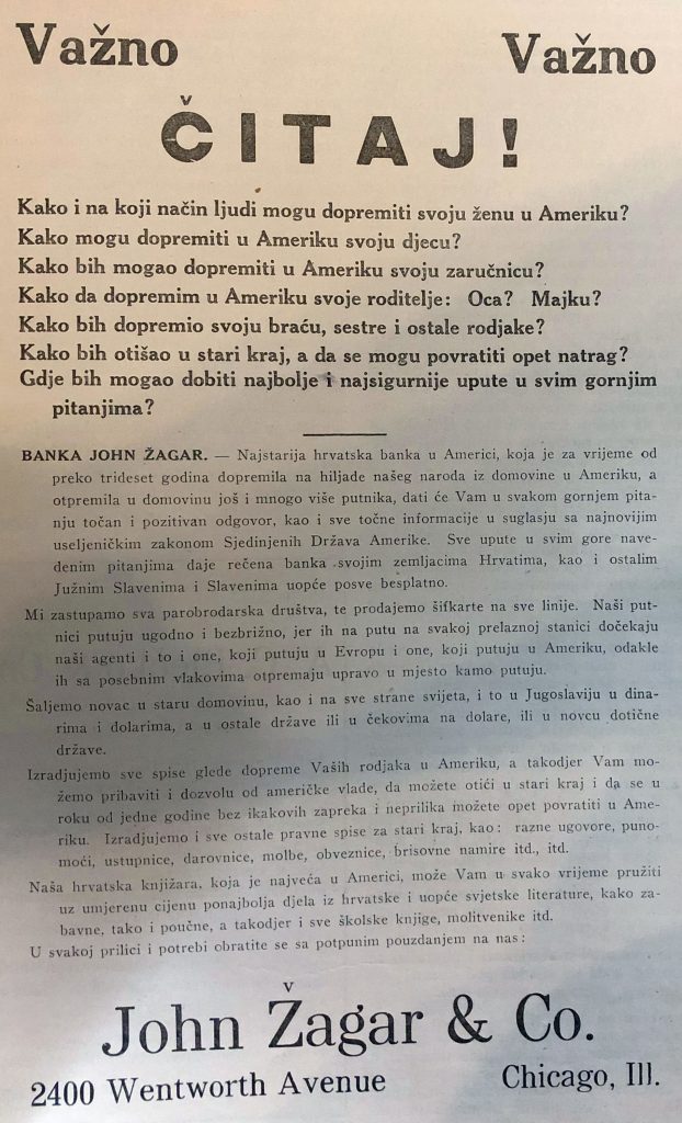 BANKA JOHN ŽAGAR, najstarija hrvatska banka u Americi, koja je u preko 30 godina dopremila na tisuće našeg naroda iz domovine u Ameriku, a otpremila u domovinu još i mnogo više putnika, dat će Vam u svakom gornjem pitanju točan i pozitivan odgovor, kao i sve točne informacije u suglasju s najnovijim useljeničkim zakonom Sjedinjenih Država Amerike. Sve upute u svim gore navedenim pitanjima daje rečena banka – svojim zemljacima Hrvatima, kao i ostalim Južnim Slavenima i Slavenima uopće posve besplatno.