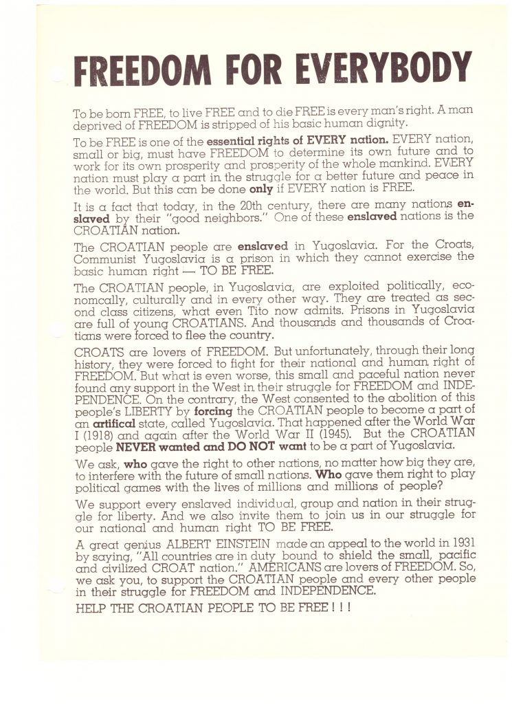 Radikalizacija nije značila samo naoružane upade u tadašnju Jugoslaviju ili napade na jugo-predstavništva. To je bio osjećaj bunta širokih razmjera. Slijedile su masovne demonstracije diljem zapadnoga svijeta. Tijekom raznih prigoda i kroz više godina, okupljalo se na tisuće Hrvata i Hrvatica, mladih i starijih, od Toronta i Vancouvera, Chicaga, New Yorka… do Sydneyja i Melbournea, prosvjedujući protiv progona u Hrvatskoj i tražeći slobodu pojedincima i hrvatskomu narodu. Redovito su paljene jugo-zastave, dijeljeni letci na raznim jezicima u kojima se tumačila pravednost hrvatske borbe, nosilo se transparente, odijevalo u narodne nošnje… Pojačano je izdavaštvo časopisa i novina na hrvatskom i drugim jezicima. Svatko je na svoj način nastojao biti glas slobode i pridonijeti domoljubnom radu. U nekoliko većih hrvatskih naseobina utemeljeni su nacionalni fondovi, oživjeli su međudruštveni odbori, rad na hrvatskoj slozi urodio je utemeljenjem Hrvatskoga narodnoga vijeća, zajedničkoga hrvatskoga predstavničkoga tijela.