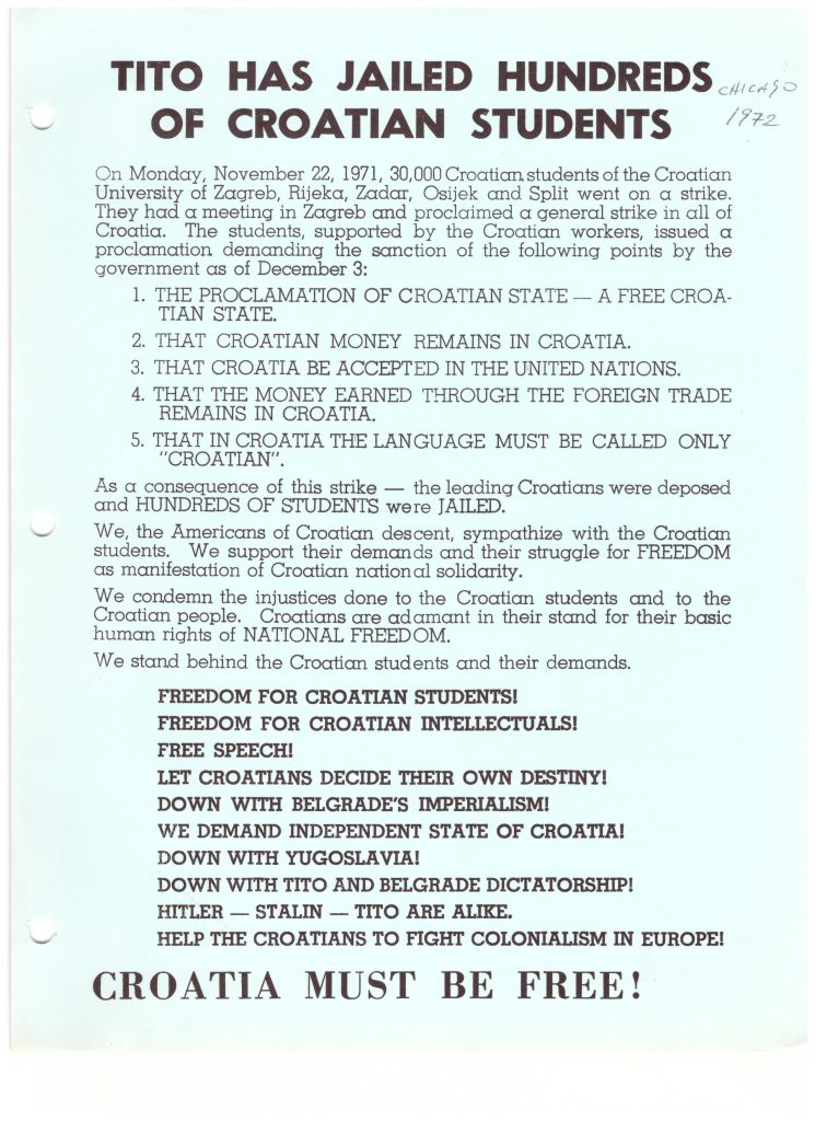 Dolazi udar iz Karađorđeva! Slijede masovni progoni: zatvaranja, suđenja, gubljenje radnih mjesta, prekidi studija, bježanje u svijet… Nastaje tajac, u Hrvatskoj se zašutjelo! Ali ti tragični događaji izrodili su važan zaokret u emigraciji – nastalo je doba masovnih prosvjeda, spontanoga revolucionarnoga bunta i obnovljenoga traženja hrvatskoga jedinstva u borbi za nacionalno dostojanstvo i slobodu. Ako je domovina bila prisiljena šutjeti, oni koji su se našli u slobodnom svijetu morali su tumačiti što se zbiva u Hrvatskoj i kakav teror podnose oni koji su tražili “komadić” slobode koju bi trebao imati svaki čovjek i svaki narod.